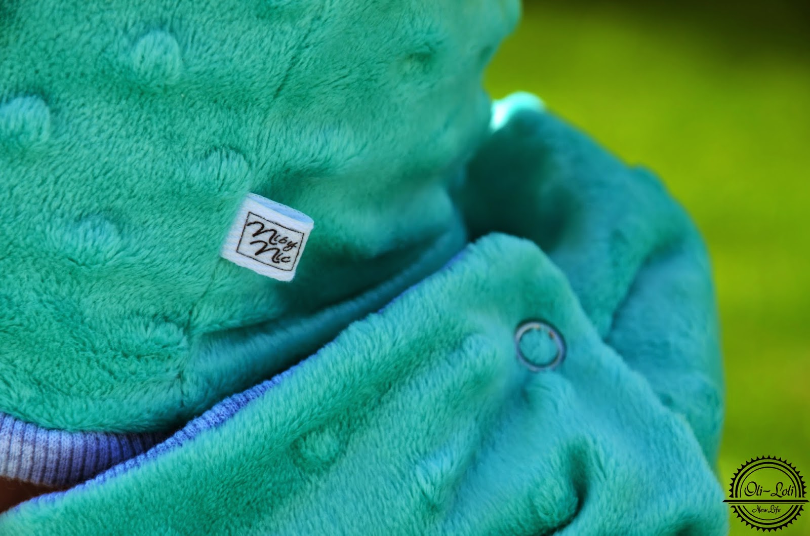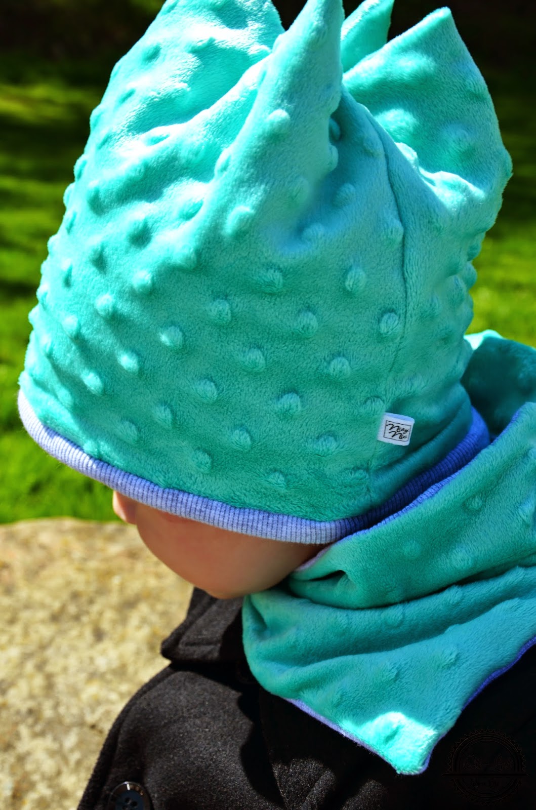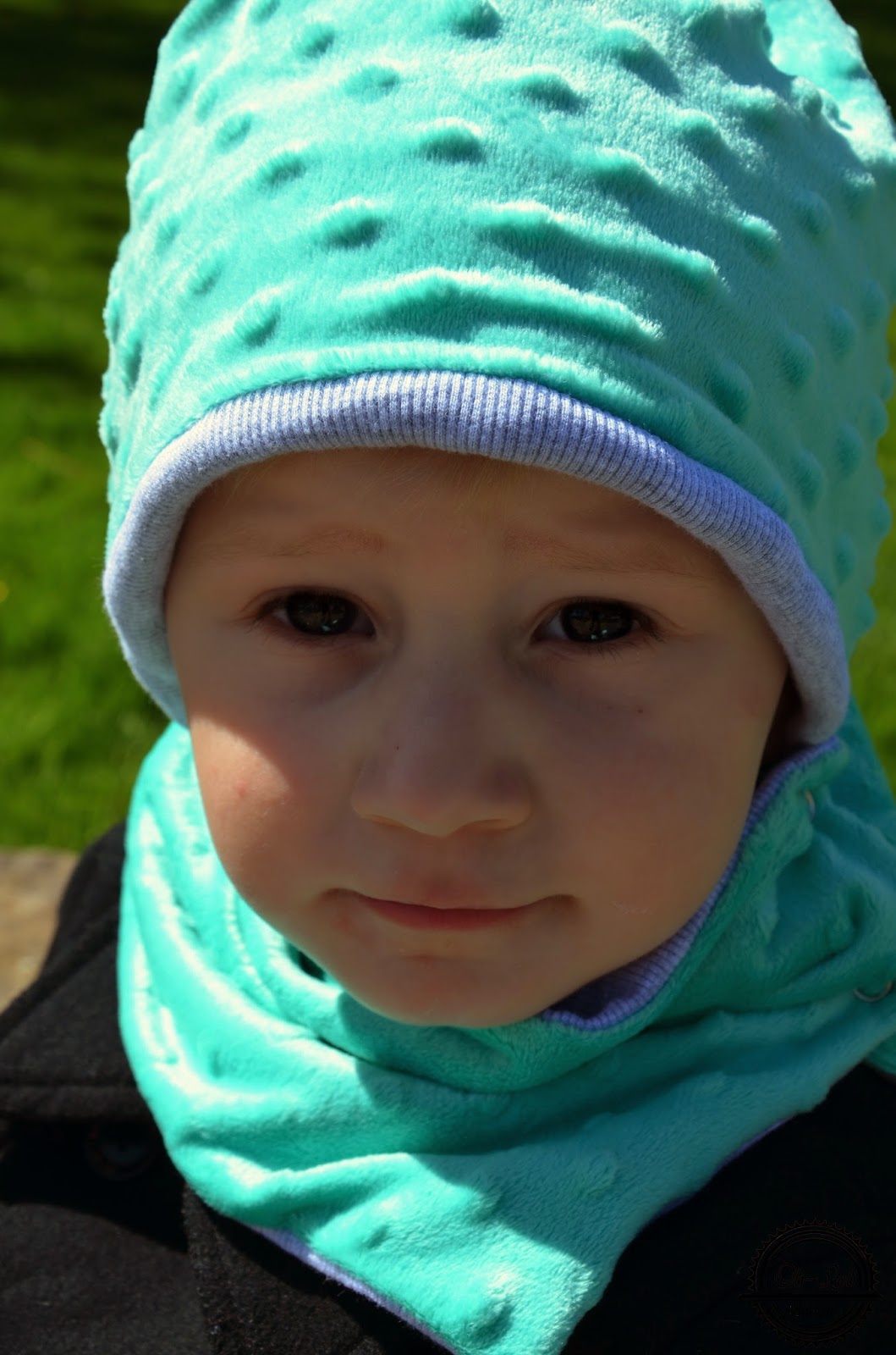 Komplet, który się u nas znalazł wykonany jest z cudnie miękkiego minky i dresówki – w moich ukochanych kolorach; miętowym i szarym! Komin zapinany na zatrzaski nie wkurzał Olisia przy ubieraniu – bo nie trzeba było go przecież wciągać na siłę. Czapka uszyta jest dość niestandardowo; synuś wołał, że ma rogi! Hi hi 🙂