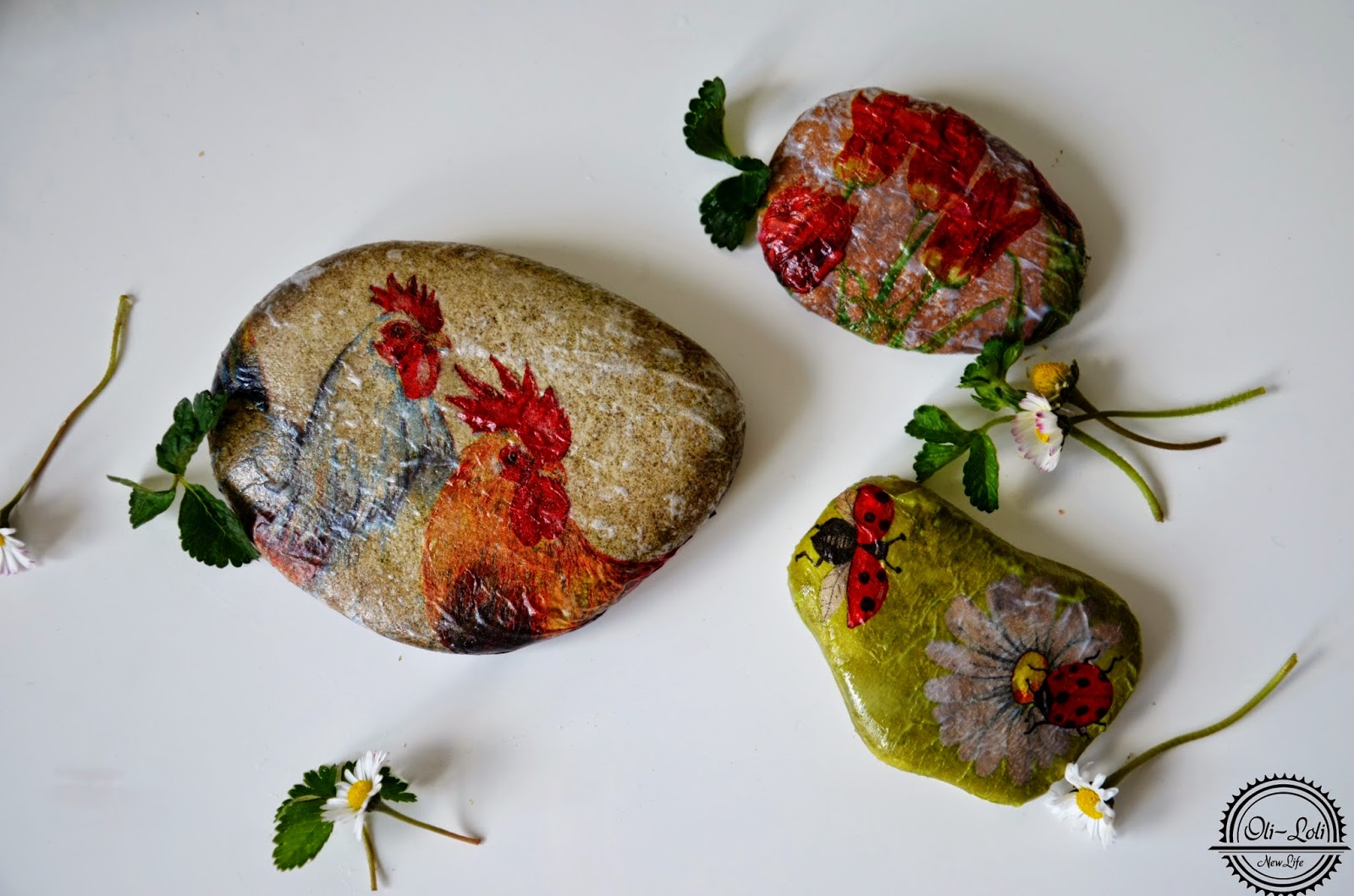 Kamloty Oliwier przyniósł ze spaceru a ja metodą decoupage przyozdobiłam je i wręczę mojej mamie. Ma sporo kwiatów w dużych donicach więc na pewno się ucieszy na prezent od zająca 🙂
