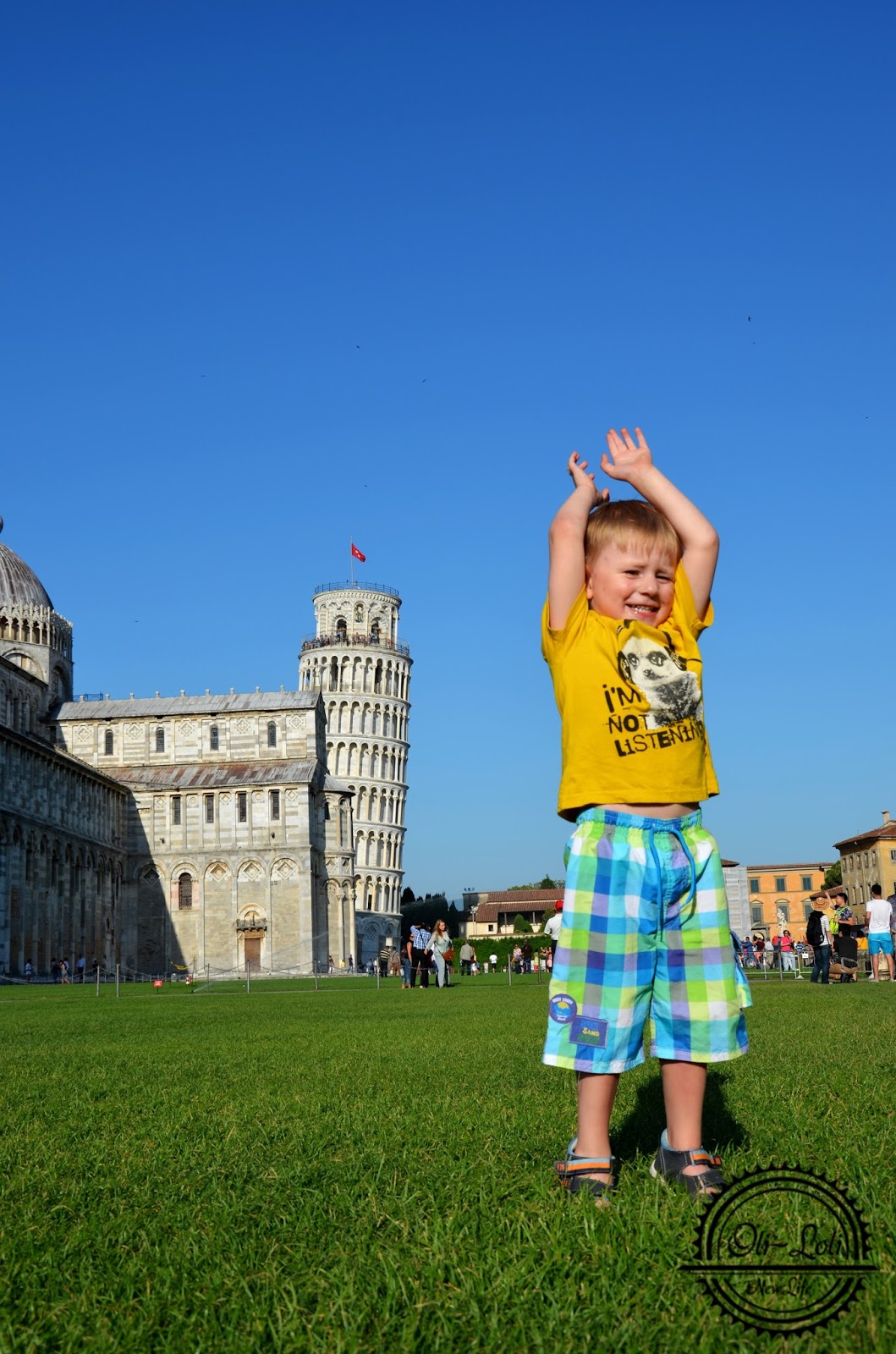 Tego samego dnia, późnym gorącym popołudniem dotarliśmy do Pizy. Oczywiście najważniejszym punktem była krzywa wieża! A najfajnieszy wielki zielony trawnik, który przyciągał Oliwiera jak magnes!