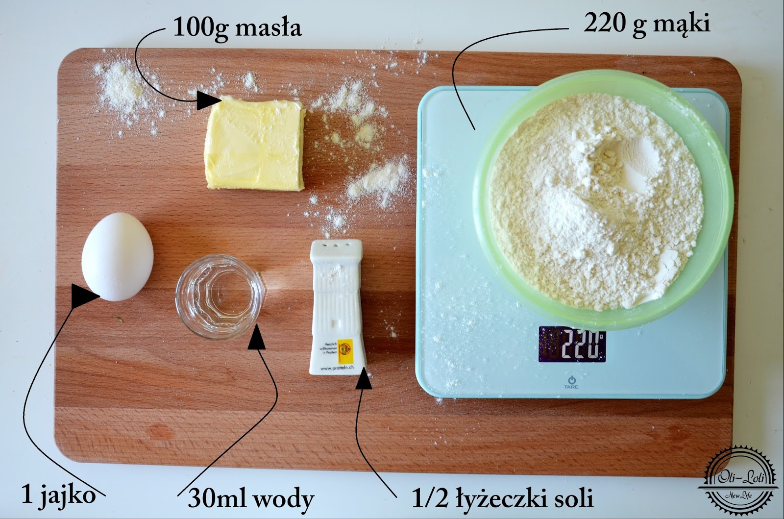 Mąkę, masło, sól, wodę i jajko mieszamy i wyrabiamy ciasto na gładką kulkę. Następnie dzielimy ją na dwa kawałki.