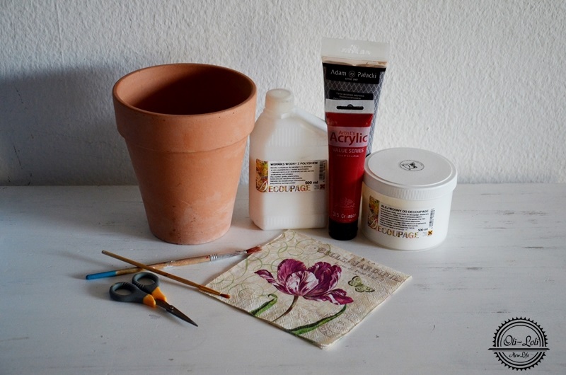 • lakier do decoupage (lub pierwszy lepszy ze sklepu, byleby zabezpieczyć doniczkę)