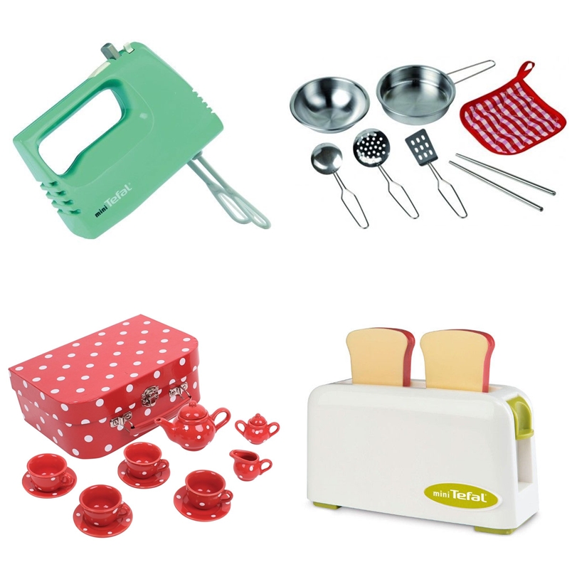 Skoro mamy już owoce, warzywa i inne produkty przydadzą się jeszcze odpowiednie narzędzia kuchenne. Zabawkowy mikser, toster czy czajnik to genialne zabawki, które spodobają się każdemu małemu kucharzowi – koniecznie na baterie i wydające dźwięki imitujące prawdziwe sprzęty.