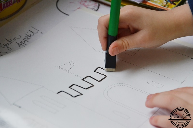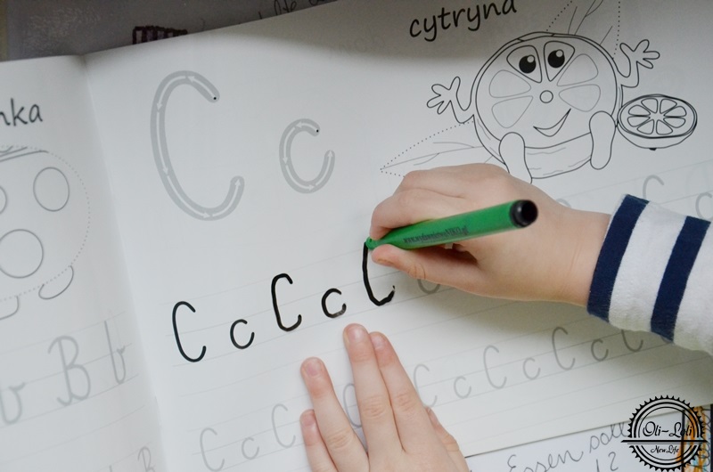 Jest też książeczka, która przypadła mi szczególnie do gustu – literki! Dziecko ma okazję uczyć się na żywca jak wyglądają poszczególne litery i trenować ich pisownię. Oliwierowi początkowo szło bardzo opornie ale coraz częściej udaje mu się je idealnie odwzorować. Oczywiście to też książeczka “zmazywalna”, w której błędy pisowni można poprawiać na bieżąco. Bonusem są naklejki – literki i kształty. Żałowałam tylko, że literek jest tak mało do naklejania ale nic straconego – już upatrzyłam sobie (a właściwie dla Oliwiera) zestaw arkuszy z literkami 🙂