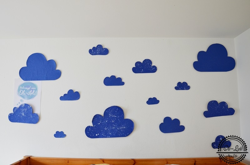 Gdy całość wyschnie, wycinamy chmurki zostawiając niewielką zakładkę (dzięki temu nie będzie widać kartonu wychodzącego spod brystolu). Kształty mocujemy do ściany taśmą dwustronną i gotowe 🙂 Właśnie zaoszczędziłaś kupę kasy – gratuluję 😀