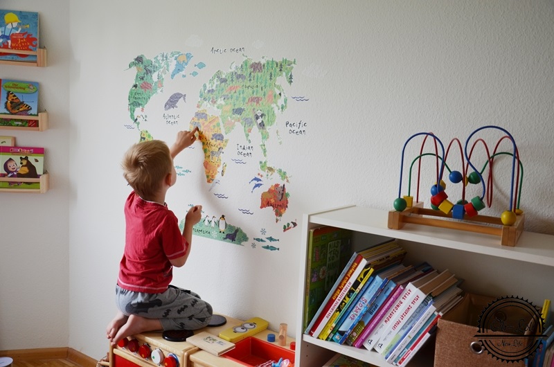 Pozostając w tematach mapa/dziecko zamówiłam na lekki ryzyk fizyk naklejkę na Aliexpres (pisałam o niej tutaj). Oliś zachwycony był wielką mapą w salonie i chciał mieć własną – no to ma 🙂 Super kolorową, świetnej jakości i o walorach edukacyjnych. Właściwie codziennie szukamy na niej zwierząt i uczymy się gdzie mieszkają. Taka opcja to świetne rozwiązanie także ze względu na możliwość zmiany wystroju gdy aktualny się znudzi.