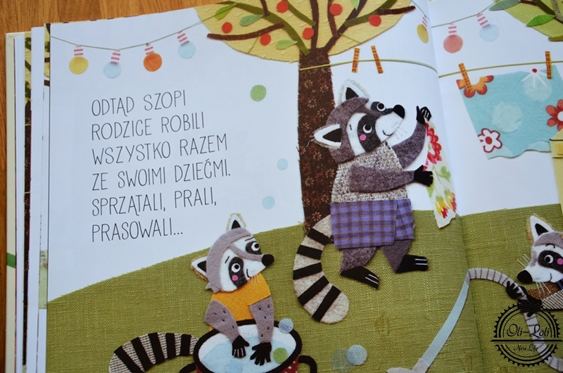 Na maluchy oczywiście czekali rodzice, którzy nauczyli się, że dzieciom trzeba poświęcać więcej czasu. Od tamtego incydentu udało im się pogodzić obowiązki i zabawę tak, by mogli wszystko robić razem. Piękny morał w otoczeniu cudownych ilustracji idealnie pasujących do motywu szopów praczy. Tekstu jest w sumie niewiele ale jest zabawny i wciąga małego czytelnika. Oliwier jednak należy do tych dzieci, które niekoniecznie chcą słuchać “czytanki” i wolą luźne mamine opowieści – więc tak sobie na zmianę opowiadamy 🙂