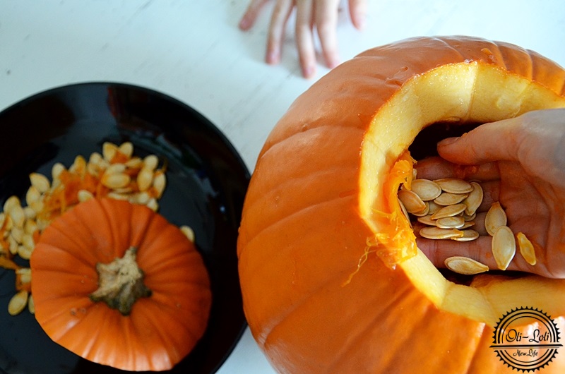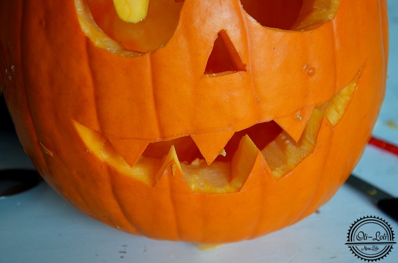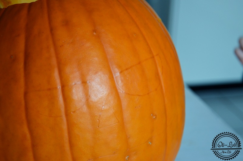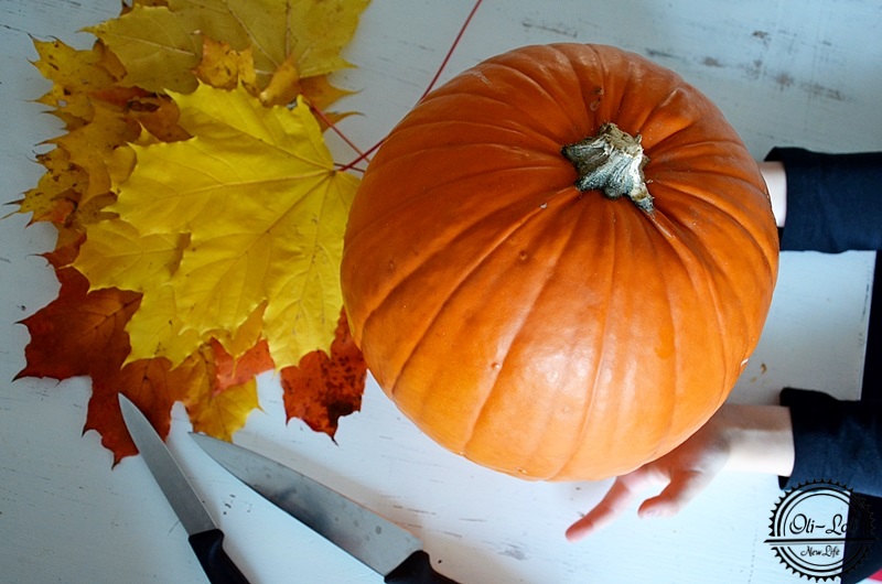 Niewątpliwym symbolem Halloween jest lampion z dyni, dlatego w tym roku za namową Oliwiera postanowiłam stworzyć własny. Młody widuje od kilku dni na wystawach sklepowych takie cudeńka więc sam również chciał mieć takiego straszaka w domu. W Spielgruppe również od ponad tygodnia królują duszki, pajączki i halloweenowe smakołyki więc czemu nie? W satanistów się bawić nie będziemy, wiary nie zmieniamy, rytualne obrzędy też nie dla nas – to tylko zabawa jak każda inna. Halloween nie jest polskim świętem, dlatego dyskusja na ten temat w naszym kraju jest dość burzliwa. Ten dzień ma oczywiście swoich zwolenników i zagorzałych przeciwników, a ja jestem gdzieś pomiędzy. Dlatego nie widzę nic złego w tym, aby wykorzystać niektóre tematyczne motywy do jesiennej dekoracji mieszkania.