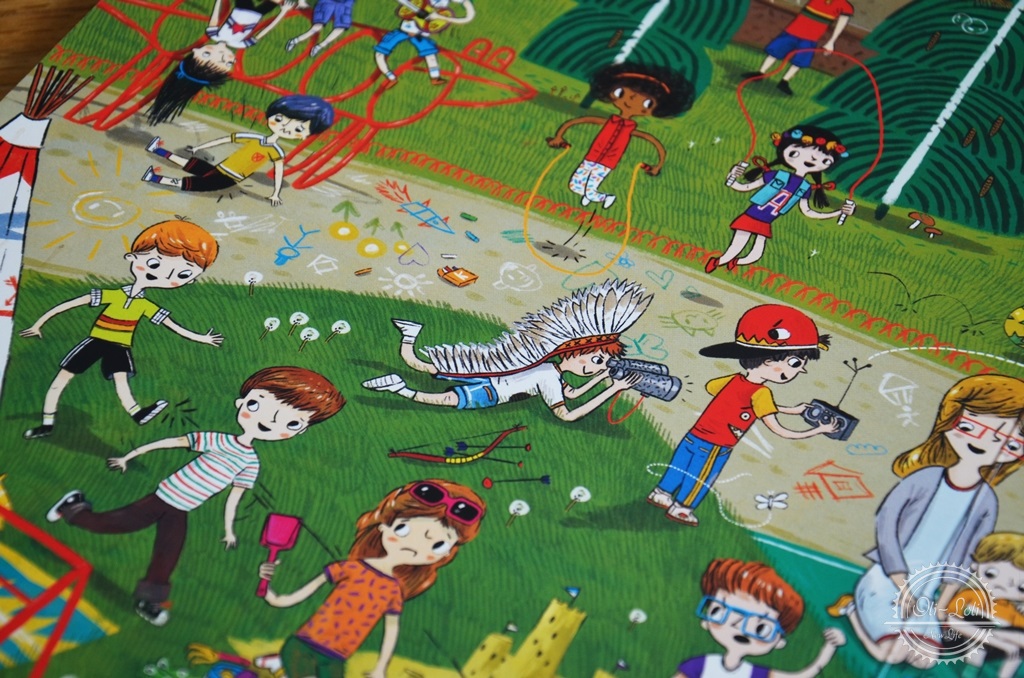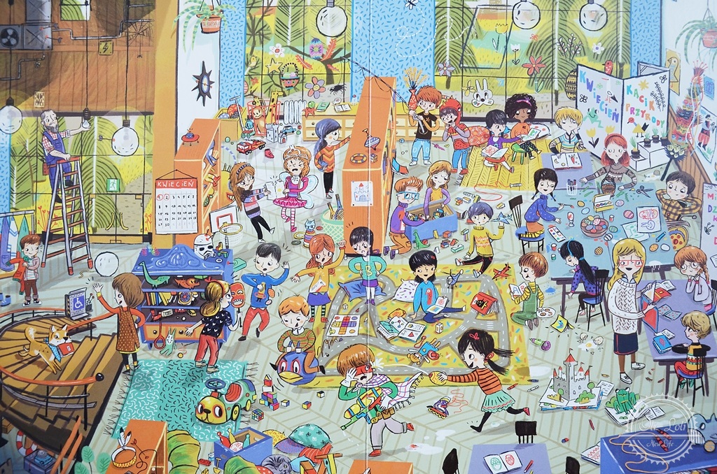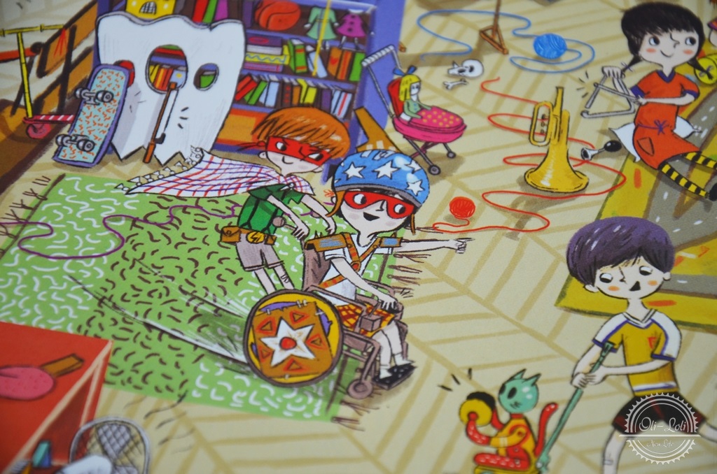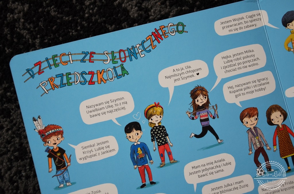 Książka przełamuje stereotypy, uczy dzieci tolerancji; wśród bohaterów znajdują się np. chłopczyk na wózku inwalidzkim czy czarnoskóra dziewczynka. Takie postaci to świetny pretekst by porozmawiać z dzieckiem o inności – dla nas jest to swobodny temat, Oliwiera nie dziwi inny kolor skóry, nie dopytuje, dla niego to całkiem normalne. Było kilka pytań o osoby na wózkach ale spokojnie udało mi się wyjaśnić tą kwestię w delikatny, dostosowany do wieku sposób. Bardzo spodobała mi się różnorodność postaci, zupełnie jakby były przeniesione z realnego życia. Mamy tutaj grzeczne dziewczynki, rozrabiaków, indywidualistkę czy urodzonego piłkarza. Czasem musimy po kolorze włosów czy fryzurze wyszukiwać swoich ulubieńców poprzebieranych na bal czy do przedstawienia, już na pamięć znamy miejsca, w których bywa kot i czym zajmuje się pies.