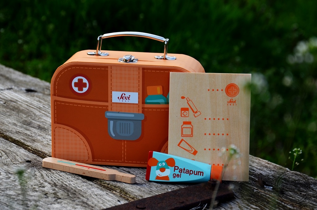 przemian w pacjenta i lekarza; badać misie i opatrywać lalki, sprawdzać temperaturę tatusiowi czy bandażować nogę babci. Zestaw lekarza nie tylko oswaja z typowymi dla zawodu gadżetami, ale też uczy praktycznego życia, rozwija wyobraźnię, komunikację i mowę. Jeśli tylko macie okazję zaopatrzcie się w drewniany zestaw małego lekarza – z pewnością wytrzyma dłużej niż zestaw z plastiku, nie będzie się psuł i łamał. My jakiś czas temu zakupiliśmy zabawkę firmy Sevi – pochwalić ją mogę za rewelacyjną jakość i świetną cenę! Do tego czasu przerobiliśmy 3 plastikowe zestawy, z których zostały szczątki.