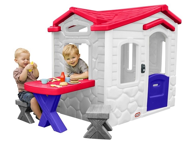Oliwier proponuje: domek z patio. Blat umiejscowiony na zewnątrz i dwa siedzonka to idealny pretekst do spożywania posiłków na świeżym powietrzu. Domek możecie kupić na smyk.com