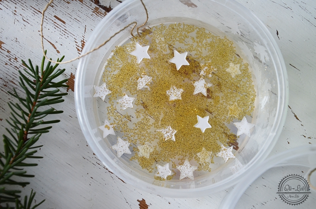 Potrzebne Wam będą płaskie pojemniki lub styropianowe tacki od mięsa. Na swoje naczynie nalejcie wodę tak, by zakryć dno, a następnie umieśćcie w tej wodzie dodatki: mogą to być cekiny, brokat, kolorowe gwiazdki, kawałki roślin, guziki i wiele innych rzeczy. Na brzegu połóżcie także kawałek żyłki lub sznureczka, który stanie się następnie uchwytem. Tak