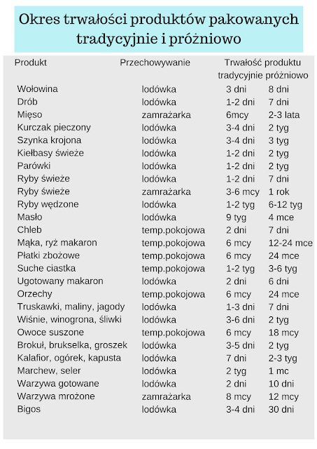 Kupujemy dużo jedzenia i zbyt dużą część wyrzucamy – to jest pewne. Urządzenia typu FoodSaver dbają nie tylko o nasze portfele, ale także sprawiają, że jedzenie smakuje inaczej – zwłaszcza marynowane. Możliwość przechowywania wielu różnych produktów sprawia, że stajemy się sami dla siebie takim małym sklepikiem, do którego możemy sięgnąć gdy zabraknie nam pomysłów na obiad czy przekąskę dla gości. Świetnie sprawdzi się przed wszelkimi imprezami; jedzenie przygotujesz wcześniej, zapakujesz próżniowo i otworzysz gdy przybędą goście – nie musisz już tłuc się po kuchni cały dzień; pracę rozłożysz sobie na raty (a nadal wszystko będzie smaczne!). Zerknij jeszcze na tabelę porównującą przydatność poszczególnych produktów do spożycia przy tradycyjnym przechowywaniu i przechowywaniu z pomocą FoodSaver – robi wrażenie, prawda?